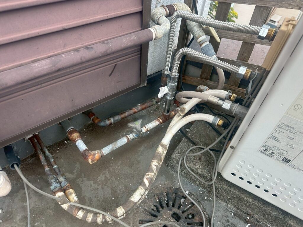 給湯器本体だけでなく、それに繋がる給水管・給湯管の経年劣化も水漏れの大きな原因です。特に、接続部分のパッキンはゴム製のため、時間と共に硬化してひび割れ、そこから水が滲み出てくることがよくあります。漏れた水が給湯器内部にかかると、電子基板やセンサーがショートし、完全に故障してしまいます。さらに、湿気が原因で不完全燃焼を引き起こしたり、集合住宅の場合は階下への漏水事故に繋がるなど、非常に危険な状態です。「配管から少し滲んでいるだけ」と軽く考えず、絶対に放置しないでください。